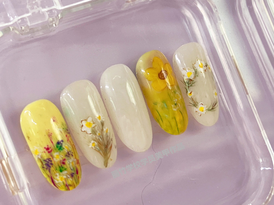 广西美甲实训、广西美甲课堂作品---春日彩绘花朵美甲解析:白色和黄色作为整副作品的主要色调,无论是作为打底色,还是拿来手绘花朵,都给人营造出了一种仿佛春风拂面,姹紫嫣红的春日感,真的是充满了的浪漫的氛围。而甲片选择椭圆形甲型,日常不刮衣还超显手细!喜爱小清新的仙女们赶紧冲冲冲!