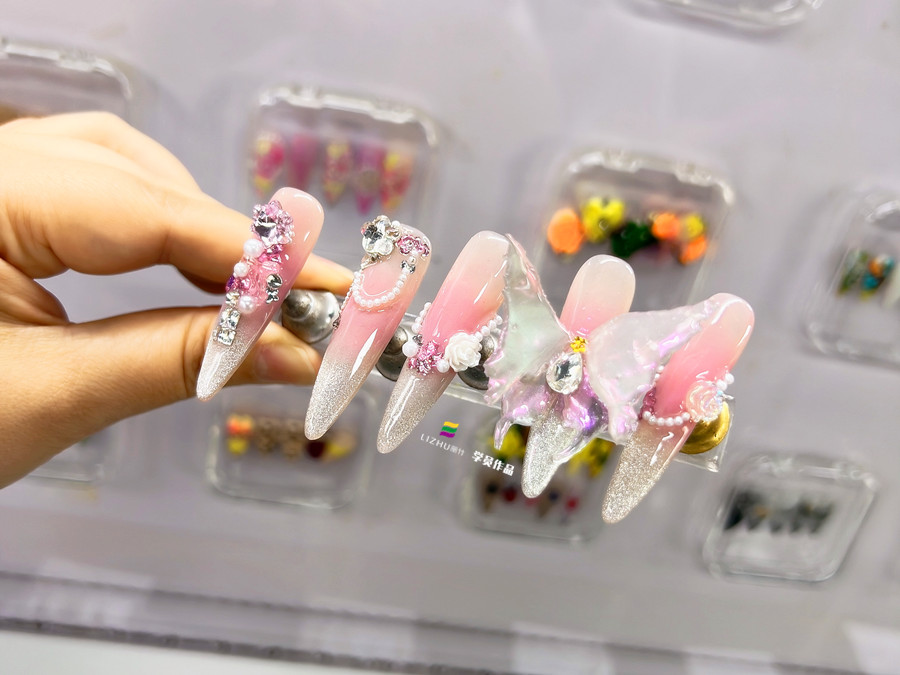 南宁美甲技能大赛、美甲作品解析:底色主要以清透裸粉色为主,之后涂抹闪粉胶打造点点星光的浪漫氛围感。为了让整个颜色更具层次感,使用渐变笔打造出渐变效果。之后选取同色系的碎砖,珍珠,花朵等饰品进行点缀。蕞后在将具有头透明粉白色的蝴蝶饰品进行粘贴,作品就完成了。戴上手上,指尖带点琉璃般的光泽仿佛把春天的柔雾裹在指甲上 ,流光溢彩。