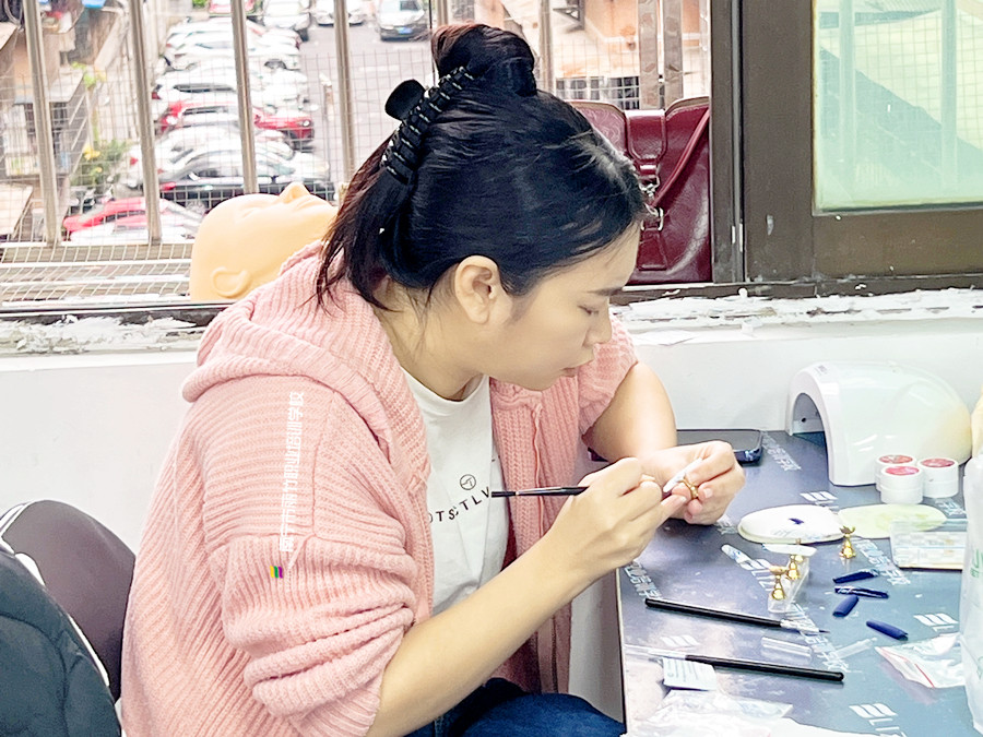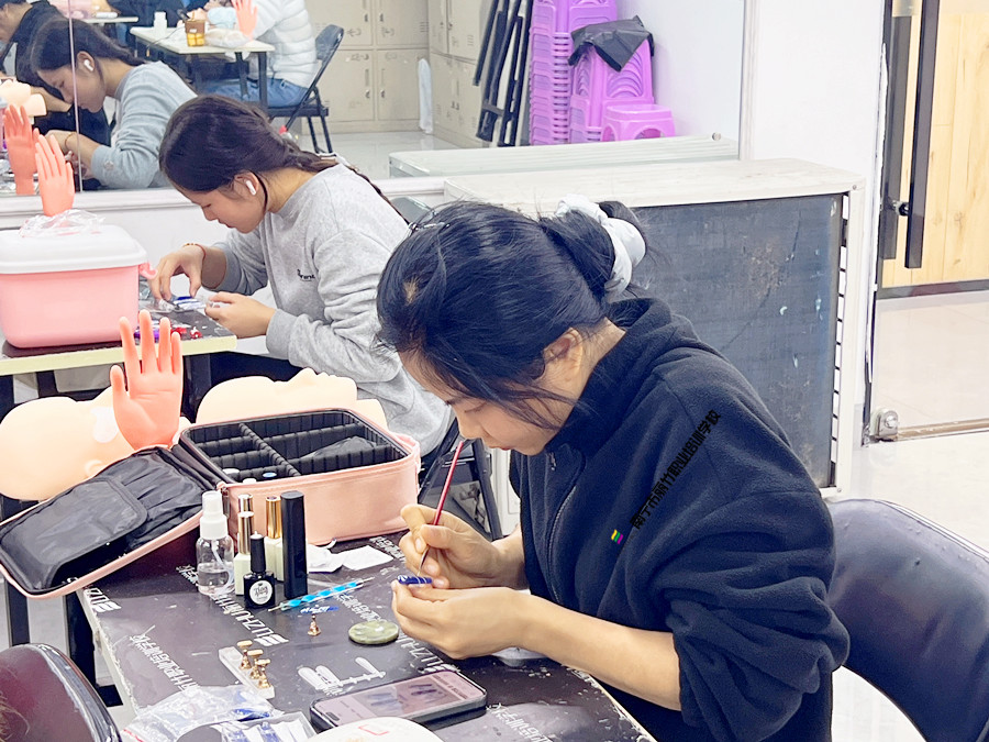 广西美甲课堂随拍、广西美甲课堂:在广西美甲进修班的教室里,到处都是学员们忙碌的身影。有的刚完成基础修形,有的在尝试渐变晕染,有的执着于贴钻,有的一笔一划描绘着图案,有的全神贯注进行雕花……同学们每一个专注的眼神、每一次小心翼翼的下笔,都在书写着从 “手残党” 到 “美甲小能手” 的蜕变故事。