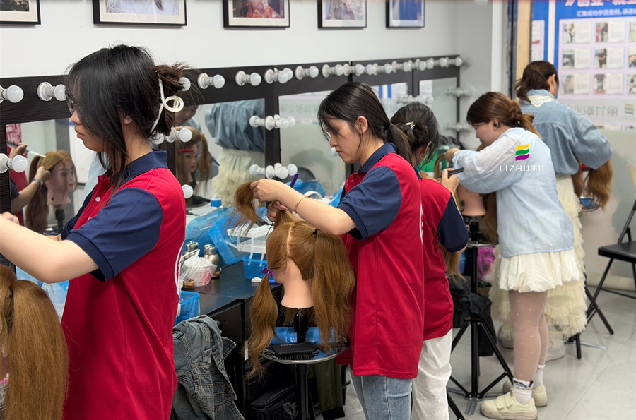 课堂上,大家专注地在头模上反复练习:分区、梳顺、扎发、盘绕、定型,每一个步骤都不敢马虎。从简单的低马尾,到精致的编发盘发,再到复杂的新娘造型,都是在一次次调整、拆解、重做中慢慢成型。