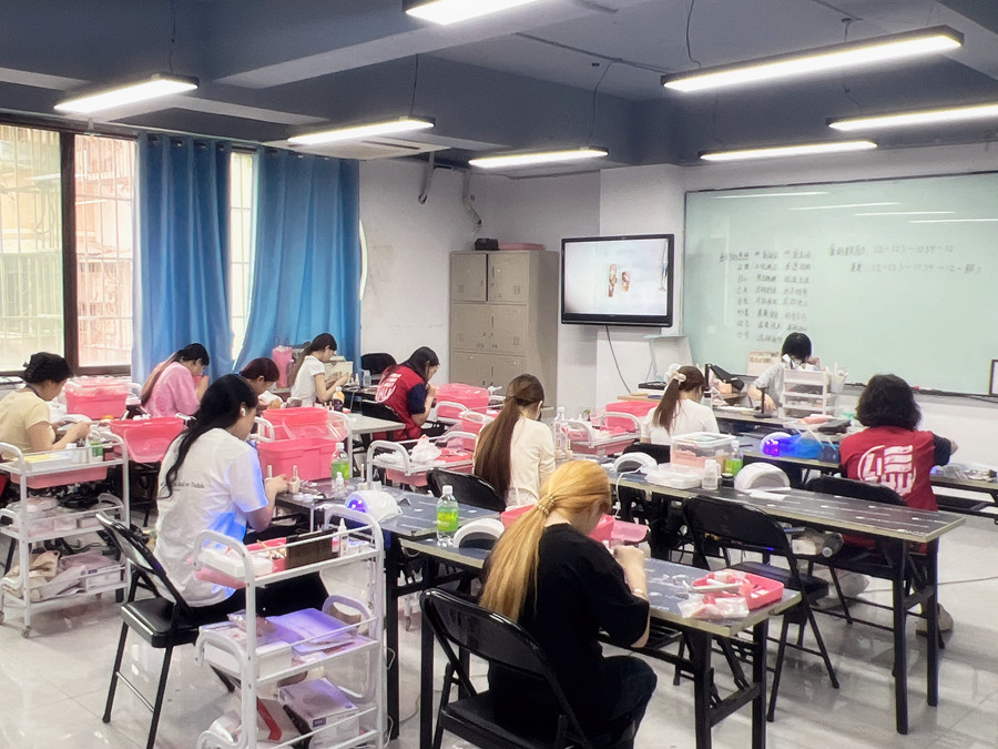 同学们在老师的细心指导下,专注细节打磨,专注技术升级,从基础进阶到复杂创意款式,循序渐进。课堂全程练习,紧贴市场商业需求,涵盖门店热门刚需款式、轻奢风、新中式、手绘艺术甲,每一笔每一画,都是努力的见证。