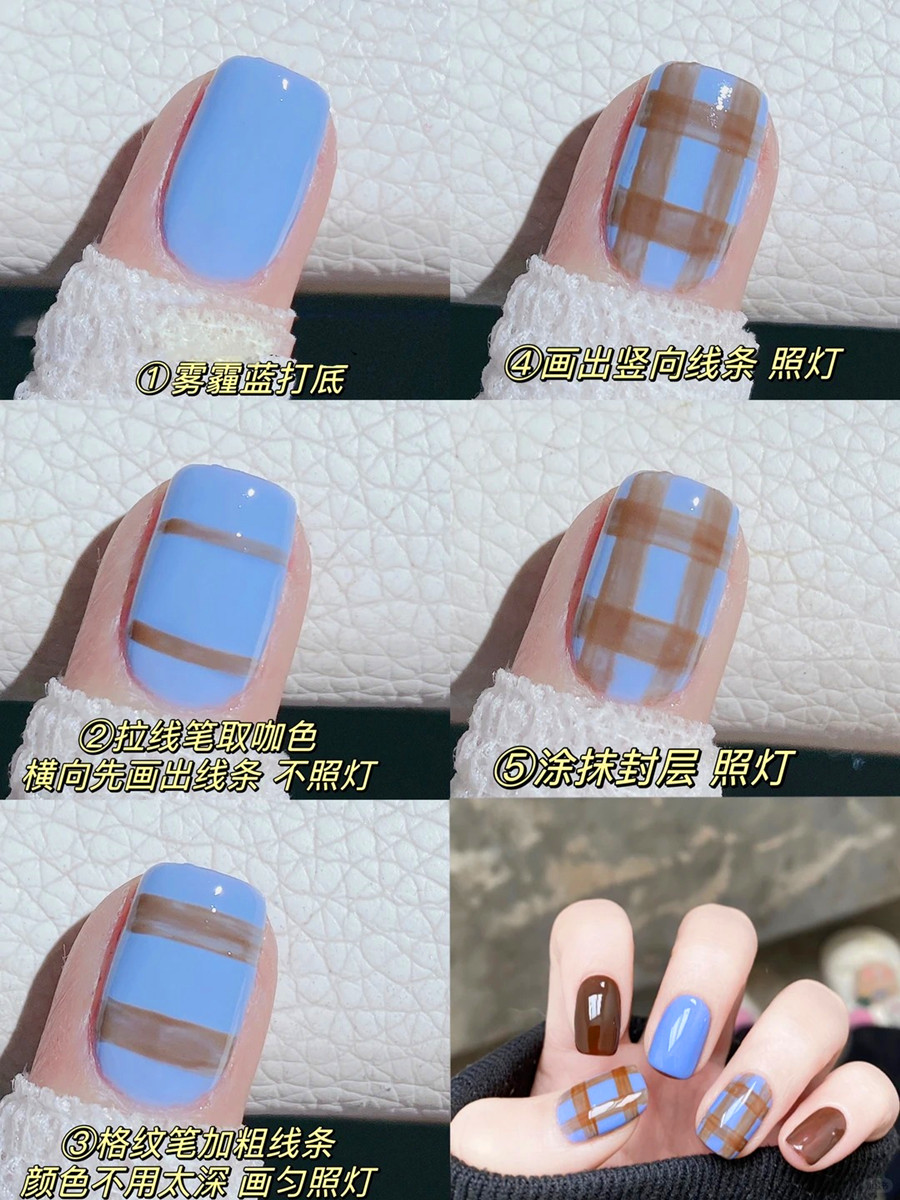 南宁美甲训练、南宁美甲学徒:极具英伦风的格纹和寒冬真的太配了。看多了传统的黑白款式的格美甲,在这个冬季里何不给寂静的白色带来一抹亮眼的色彩呢?如果你不想继续做一层不变的格纹美甲,那就赶紧来看看南宁美甲职业学校(丽竹美甲职业学校)分享的清新蓝格纹美甲教程吧!