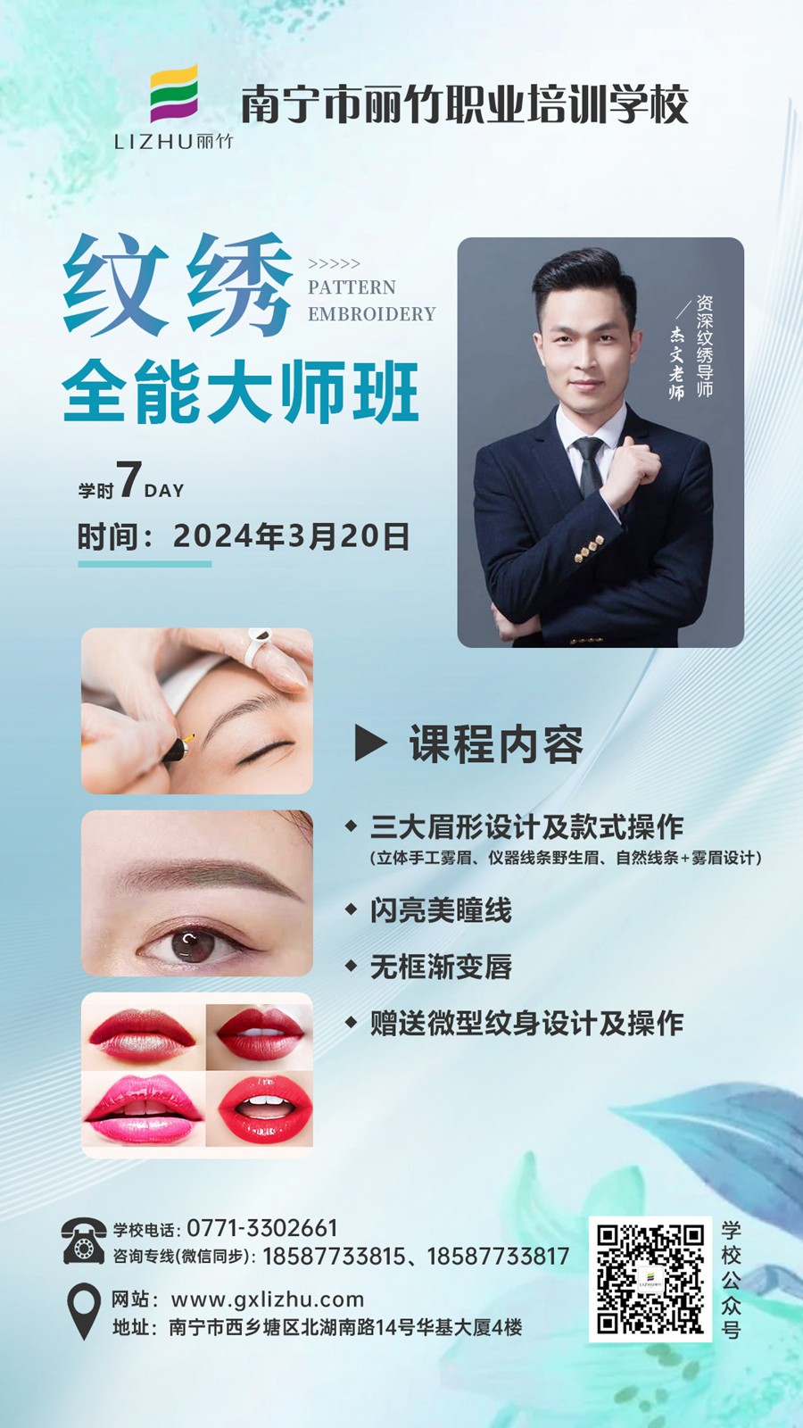 南宁纹绣培训、南宁纹绣学校排名:想在南宁学纹绣,想知道南宁纹绣学校哪家好?南宁纹绣学校排行榜推荐你,可以到南宁纹绣培训学校(丽竹纹绣培训学校),去了解即将在3月20日开班的纹绣全能大师班的详细课程内容以及报名优惠活动。