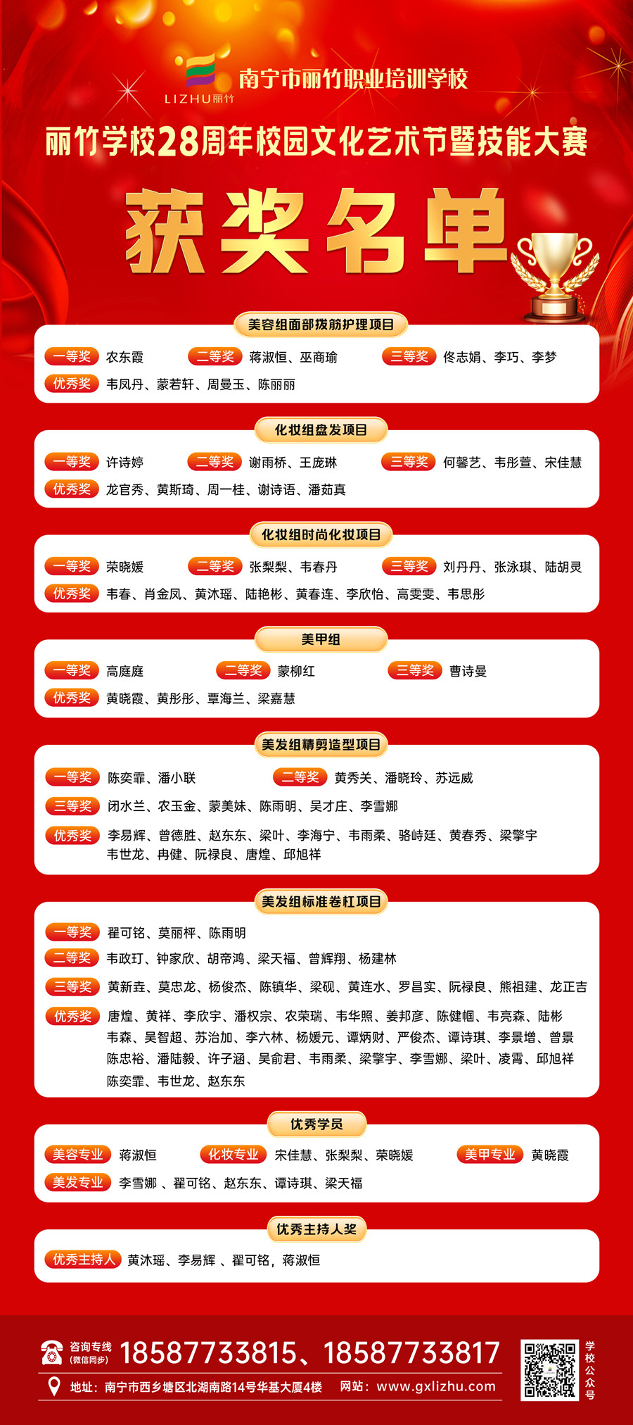 南宁美容美发、南宁化妆美甲:作为全校年度蕞具分量的盛会,南宁美容美发化妆美甲学校-丽竹学校28周年庆典校园文化艺术节暨技能大赛颁奖盛典于11月13日下午在多功能厅隆重举行。各大专业(美发,美容,化妆,美甲)的奖项通过老师评委团秉承“公平,公正,公开”的原则也“名花有主”。接下来一起来看看同学们都获得哪些奖项吧!